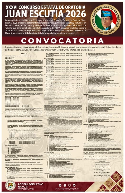 El Concurso Estatal de Oratoria Juan Escutia 2026 abre convocatoria para niñas, niños y jóvenes de Nayarit.