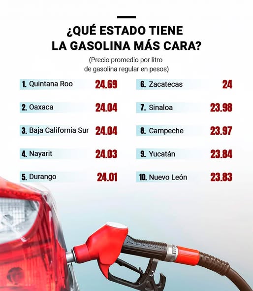 De acuerdo con el precio promedio por litro de gasolina regular, Nayarit se posiciona como el cuarto estado con el combustible más costoso en México, alcanzando un promedio de 24.03 pesos por litro.